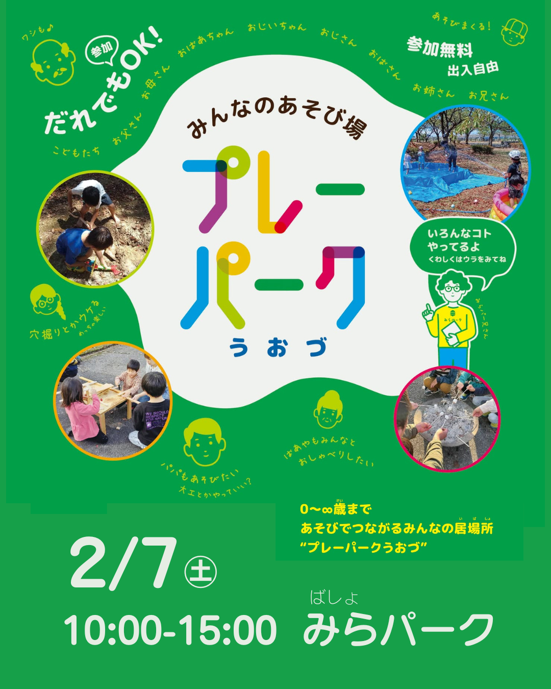 NOV 25 2025 イベント プレーパークうおづ2025 今年も開催!1年通してプレーパークを楽しもう! 日本各地で今話題の新しい公園の使い方「プレーパーク」を体験しよう! 長野県からプレーリーダーさん2名が来園。 ~プレーパークとは~ 自分の責任で自由にあそぶ。 こども自身で考え、あそびをつくる場「プレーパーク」 プレーリーダーと呼ばれる”あそびの達人”と一緒にみらパークで思い切りあそびましょう! プレーパークうおづ2025表 プレーパークうおづ2025裏 目 次 みたいコンテンツ名をクリックし、詳細をチェックしよう! ● 2/7(土) 冬を楽しもう 【今年度の開催分】 〇 11/22(土) あったかい居場所を楽しもう!× インクルーシブプレーパーク 【終了しました】 〇 10/11(土) 秋を楽しもう!【終了しました】 〇 8/29(金)-30(土) 夏を楽しもう!× irodori marche Vol.4 【8/17詳細更新!】【終了しました】 〇 8/2(土) みらパーク×凸凹っこ作戦会議~インクルーシブプレーパークを考えよう~【終了しました】 〇 プレーパークのこれまでの活動紹介 プレーパークってどんな場所なのか見てみよう♪ コンテンツ紹介 冬を楽しもう! ■2026年 2月 7日(土) 10:00-15:00 〇飲食ブース ・Ume Kitchen・・ドッグパン、ソフトクリーム他 ・むすびや・・おにぎり他 ・KOMUGISAN・・スイーツ ・KEseRA・・ガパオライス他 <募集は〆切ました> あったかい居場所を楽しもう!× インクルーシブプレーパーク 【このイベントは終了しました】 ■ 2025年11月22日(土) 10:00-15:00 当日の模様はこちら!天候にも恵まれ、沢山のご来場、誠にありがとうございました! 大人も子どもも、障がいのある子もない子も、 み〜んなが一緒に楽しめる “あそび場” を開催します! 富山県内3市の子育て支援団体が座談会や作戦会議を重ねてつくった あたたかい想いがぎゅっと詰まった1日。 インクルーシブプレーパーク 〜あったかい居場所を楽しもう〜 日時:11月22日(土)10:00〜15:00 場所:みらパーク公園内(魚津水族館となり) 参加無料・出入り自由 〇 グラウンドルール ・自分のペースで自由にあそぼう ・あったかいまなざし・言葉でつながろう ・困ったときは話し合おう 〇 いっしょに外あそびしよう! サポートスタッフもいます。 〇 見守りを希望される方へ でこぼこっ子サポートスタッフによる見守りを希望される方は、事前に申込フォームよりご連絡ください。 ※託児ではありません。安全には配慮していますが、事故・けがの責任は負いかねます。 〇 サポーター募集中! 運営を支えてくれる仲間も大歓迎✨ 〇 持ち物 <晴天時>汚れてもいい服・着替え・タオル・飲み物 <雨天時>上記+雨具 当日はキッチンカーも多数出店予定! お会いできるのを楽しみにしています☺️ 近年、発達特性のある子を育てる保護者からは、「公園で周囲に気をつかい続けて疲れてしまう」 「“迷惑をかけないように”と人の少ない公園を探し回る」といった切実な声が聞かれます。 また、富山県内では通年のプレーパークを常設している公園がなく、子どもたちが自由に遊べる環境は十分とは言えません。 そこで今回は、保護者の孤立感や不安に寄り添うとともに、子どもが主体的に遊び、異年齢・異世代で関わり合える環境を提供したいと思いました。 「与えられた遊びではなく、自ら遊びを生み出せる自由」を地域に示すことを目指します。 <グランドルール> <こんな”あそび”があります!> <てがたアートをつくろう!> 協力/富山県立魚津高等学校 <飲食ブース> ・Cafeアルモンデ・メデル・・ドリップコーヒー他 ・むすびや・・おにぎり他 ・多幸屋・・・たこ焼き、お好み焼き、たい焼き他 ・ターさんタイ料理・・ガパオライス、パッタイ他 <募集は〆切ました> 主催:NAPs 共催:魚津市、ミラージュランド、とやま凸凹きっず応援団 協力:富山県立魚津高等学校 秋を楽しもう! 【このイベントは終了しました】 ■ 2025年10月11日(土) 10:00-15:00 夏を楽しもう×irodori marche vol.4 【このイベントは終了しました】 ■ irodori marche vol.4 8月29日(金)-8月30日(土)10:00-16:00 ■ プレーパーク 8月30日(土) 10:00-15:00 irodori marche vol.4 irodori marche vol.4 プレーパークイメージ プレーパークイメージ \富山にもっと華やかな彩りを/ 富山の子育てをしているパパ・ママたち 家族みんなが楽しめる 「irodori marche🕊️🌈vol.4」 2025年8月29日(金)30日(土)の2daysで 魚津水族館となりみらパークにて開催!! いろどりマルシェ1周年を記念して2days開催が決定いたしました! ・夏休みの自由研究にぴったりなワークショップ ・ベビーやキッズ向けのお洒落なこども服 ・ハンドメイドアクセサリー ・赤ちゃんとお母さんのためのベビーマッサージ ・おなかがすいたらキッチンカーでお食事などなど、、! わくわく楽しい夏休みの思い出にぜひいろどりマルシェに遊びにきてね♪ \さらにさらに!/ ご来場者さま限定のイベントも盛りだくさん‼ 魚津水族館無料入場券など豪華プレゼントが当たる♥ 「ハズレなしのくじ引き」いろどり限定オリジナルグッズも♡ 県内外より総勢50店舗(