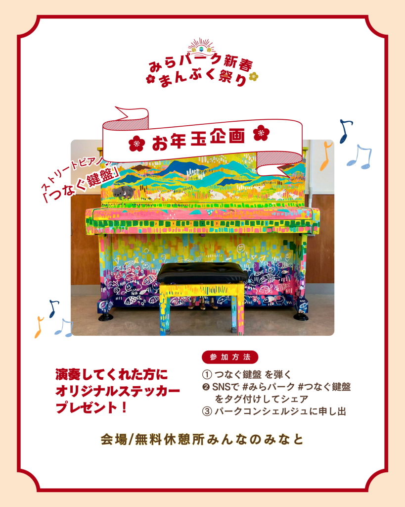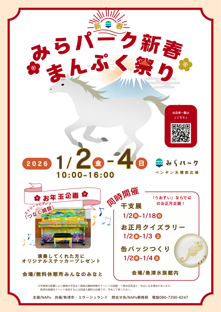 DEC 26 2025 イベント みらパーク新春まんぷく祭り2026 【このイベントは終了しました。沢山のご来園ありがとうございました!】 新年最初のみらパークはグルメでお祝いしよう♪ \みらパーク新春!まんぷく祭り/ いつも出店してくれているあの店から久しぶりのお店、新店まで! 新年の幕開けの3日間、毎日日替わりで出店決定! 魚津に帰省するけど、どこ行こうか迷ってない? こたつでゆっくりのお正月もいいけど、久しぶりに水族館はいかが? そうだ! みらパークへ行こう♪ さ・ら・に! 1/4(日)はパフォーマーTANEが緊急参戦! 会場を盛り上げます♪ お正月の料理とはまた違ったグルメを楽しみにぜひお越しくださいね 日 時 1月2日(金)~1月4日(日) 10:00-16:00 ※各店なくなり次第終了 会場/魚津総合公園(みらパーク)内無料休憩所みんなのみなと及びペンギン水槽前広場 (魚津市三ケ1390番地魚津総合公園内) 出店者一覧(順不同) 2日(金) <キッチンカー> ・M’s One・・トルネードポテト、ロングポテト ・ふたば&笑顔咲く・・フライドポテト、唐揚げ他 ・玄米粉おれんじぼーる「だいだい」・・米粉たこ焼き、たい焼き、甘酒他 ・Matatabi・・クレープ、コーヒー、ソフトドリンク他 <屋内出店> ・time passes・・・コーヒー、ソフトドリンク、ドライフラワー等 ・ACHA YATRA・・・スパイスカレー等 【初出店】 ・jasmine・・耳つぼダイエット体験、アクセサリー販売など 3日(土) <キッチンカー> ・M’s One・・トルネードポテト、ロングポテト ・ふたば&笑顔咲く・・フライドポテト、唐揚げ 他 ・玄米粉おれんじぼーる「だいだい」・・米粉たこ焼き、たい焼き、甘酒 他 ・Matatabi・・クレープ、コーヒー、ソフトドリンク 他 ・マリーモワルー・・肉巻き、丼ぶり、ホットスープ 他 <屋内出店> ・出張珈琲屋コーフィバル・・ドリップコーヒー 他 ・坂の上のベーカリー・・各種手作りパン 他 ・time passes・・・ホットスープ、ドライフラワー 等 ・射的屋えんらく・・射的などの縁日コーナー 【初出店】 ・そとあそびひろば やわやわ・・バザー、松ぼっくり釣り 他 4日(日) <キッチンカー> ・M’s One・・トルネードポテト、ロングポテト ・ふたば&笑顔咲く・・フライドポテト、唐揚げ 他 ・むすびや・・おにぎり 他 ・玄米粉おれんじぼーる「だいだい」・・米粉たこ焼き、たい焼き、甘酒 他 ・Matatabi・・クレープ、コーヒー、ソフトドリンク 他 <屋内出店> ・time passes・・・コーヒー、ソフトドリンク、ドライフラワー 他 ・ACHA YATRA・・・スパイスカレー等 <パフォーマー 情報> パフォーマーTANE ・・大道芸 他 通年出店者募集中!新規様提出資料はこちら ※まんぷく祭りへのエントリーは応募多数の為終了しました。 お年玉キャンペーン 無料休憩所に常設しているとってもカラフルなストリートピアノ 「つなぐ鍵盤」を一般開放します! 楽譜持ってお越しください♪ 更に!つなぐ鍵盤を演奏してくださった方にオリジナルステッカープレゼント! 参加方法 ① つなぐ鍵盤を弾く ② SNSで #みらパーク #つなぐ鍵盤 をタグ付けしてシェア ③ 当日みんなのみなとにいるパークコンシェルジュにお申し出ください。 富山県魚津市を旅した思い出にもどうぞ。 ピアノを習っている方の発表会ですこしでも緊張しないために人前でのリハーサルなどにもご活用いただいております! 上手に弾けなくてもOK!音楽を楽しんでいただきたいと思っています! 2024年2月号の月刊ピアノに特集されました! お年玉キャンペーン期間 1月2日(金)~1月4日(日) 10:00-15:30 事前申込不要 ※「つなぐ鍵盤」は公園に来園頂ける皆さんがいつでも心地よい音楽にふれていただけたらと思い設置しています。 乱暴な演奏や長時間の占有などはなさらず、マナーを守って演奏して下さい。 SNSにアップする際は周りのお客様が映らない様ご配慮下さい。 食べ物を食べながらの演奏はピアノを汚し、故障の原因になるためおやめください。 演奏する際は手をきれいに洗い、清潔な手でお願いします。 魚津水族館 イベント多数開催! 魚津水族館ではお正月にちなんだ企画展示やワークショップを多数開催! 詳しくは 魚津水族館ホームページ 公式Instagram または 広報うおづ12月号をチェック! ※別途入館料が必要です。 おねがい ※当日の天候や都合により予告なくイベントの短縮・中止・出店者の変更になる場合があります。予めご了承下さい。 当日の出店状況はみらパークInstagram 当日ストーリーをお見逃しなく! 主催/NAPs 共催/魚津市、ミラージュランド 問い合わせ先/NAPs事務局 電話・080-7290-6247 受付時間:10:00-16:00(水曜定休)E-mail・contact@uozupark.com Tweet Share +1 Hatena Pocket RSS feedly Pin it 投稿者: uozupark-adminイベント, パークコンシェルジュ通信コメント: 0 【9月20(土)-21(日)】RE... プレーパークうおづ2025