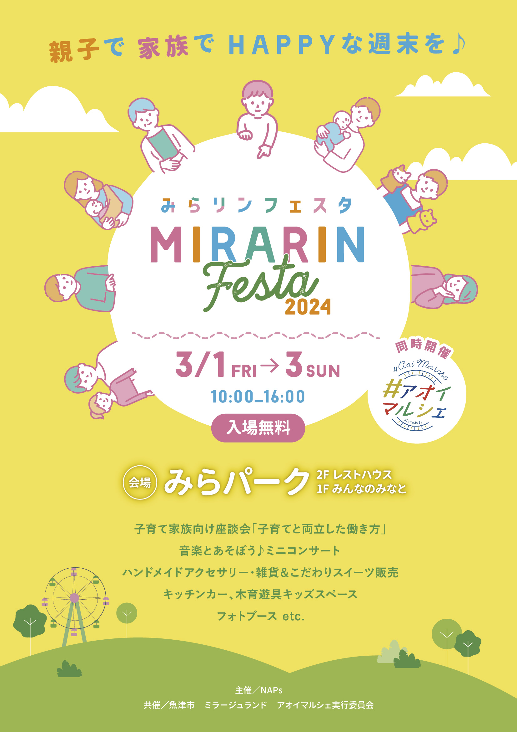 FEB 18 2024 イベント みらリンフェスタ2024開催決定! 【このイベントは終了しました!沢山のご来場ありがとうございました】 みらリンフェスタ2024開催 テーマは「親子で、家族でHAPPYな週末を♪」。 県内のこだわりスイーツ販売、雑貨やアクセサリー、赤ちゃんとママが楽しめる体験ブース、県内で活躍するキッチンカーも大集合! この他、楽しいコンテンツが盛りだくさん。一足早く「春」を感じにみらパークへ遊びに来ませんか? 今回は県内の様々な場所で展開している「#アオイマルシェ」との同時開催。 盛り上がること間違いなしの3日間。是非お待ちしております。 最近よく耳にする「コワーキング」「在宅での仕事」について、市内外で活躍している方と来場者様との座談会や、お子様も参加していただけるミニコンサートなどもり沢山。 期間中は昨年7月オープンした子育てコワーキングスペース「みらリン」のオススメポイントを紹介! 更に日頃様々なイベントに参加してくだっている皆様への感謝イベントとして平日と祝日の3日間に渡って開催します。 お友達と。ご夫婦で。ご家族で。どなたでも大歓迎です。 チラシが完成しました!!(2月26日更新) みらリンフェスタ2024 みらリンフェスタ2024 開催日 2024年3月1日(金)2日(土)3日(日) 時 間 10:00-16:00 場 所 魚津総合公園(みらパーク)内 無料休憩所「レストハウス2階」及び無料休憩所「みんなのみなと」 入場無料/出入り自由 スペシャルイベント ―DAY1― 座談会 ―在宅でもできる仕事で子育てと両立した働き方― 来場された皆さんとワイワイおしゃべりしながら県内で既に様々なジャンルで在宅勤務を実現しているゲストスピーカーの方とおしゃべりしましょう。 出産を機に転職や自分らしい働き方を探している方への疑問などを解決できるよう、お話します。 日程:3月1日(金) 時間:10:30~11:15 場所:レストハウス2F 参加:無料 講師:コーチング講師 髪口みどりさん、ライター東るにさん、富山県女性支援センターの職員 司会:NAPs中島 ―DAY2― 音楽とあそぼう♪ 親子で楽しめる参加型・ミニ音楽コンサート。 歌とバイオリンとピアノで親子参加型のセッション♪ このみんなの知っているあの名曲も?!パネルシアターもあるよ♪ 日程:3月2日(土) 時間:①11:00~ ②13:30~ 場所:みんなのみなと特設ステージ 歌とバイオリンとピアノで親子参加型のミニコンサート♪ 出演者:「レインボーand ふたごな親子」 バイオリン島田 恭歌、ピアノ髙柳 真理 と現役保育士親子でお送りします。 参加:無料 〇「レインボー」とは 虹は7色、音は7つ(ドレミファソラシ)、お客様の心に虹の橋をかけて、心に響く演奏で幸せを届けたいと思い、名付けました。 ―DAY3― 公園ピアノ「つなぐ鍵盤」一般開放 カラフルなペイントピアノ「つなぐ鍵盤」を大解放! あなたの音色を聞かせてください。 混み合った場合は一人10分まで 3日間 随時開催 大道芸人パフォーマンスショー 会場:みんなのみなと特設ステージ 時間:タイムスケジュールをチェック! パフォーマーTANE パフォーマーささまん ステージタイムスケジュール完成! 〇子育てコワーキングスペースPRブース 会場:レストハウス2F ・子育てコワーキングスペースPRブース&キッズスペース&木育遊具「なんじゃらっホイ」であそんでみよう。 アンケートに答えてくれた方へ3月中旬からミラージュランドで使用できる大観覧車1回招待券進呈! 同時開催 #アオイマルシェ inみらパーク 日程:3月1日(金)~3月3日(日) 時間:10:00-16:00 場所:みんなのみなと及びレストハウス2F 参加:入場無料 アオイマルシェ厳選!! キッチンカー大集合!気になっていたあのお店にあえるかも! この他、赤ちゃんとママ、ご家族連れにもうれしいオリジナルハンドメイドアクセサリー雑貨やこだわりスイーツ販売など、個性豊かなブースが目白押し! 出店者の詳細はアオイマルシェ公式Instagramをチェック。 主催者さまからコメントが届きました! はじめまして! #アオイマルシェは、富山県内で全国の「てづくり」が一挙に揃うイベントです。 県内外の作家さんによるハンドメイド雑貨やオリジナル商品などを多数出店。 キッチンカーやワークショップなど、買って・食べて・体験できるお祭りです。 魚津市で行うのはこのみらパークが初めてです! あなただけのお気に入りを見つけてください。 >>>> @mirarin_uozu もあわせてチェックしてね! 春の訪れと共に皆さんに会えるよう、準備中です! あなたのカレンダーにも『みらリンフェスタ』ってメモしておいて下さい🙏🙏 レストハウス2F内へのベビーカーはお入れできません。 その他 タクト2月号に掲載されました! 読売新聞フリーペーパー「みんと」へ掲載されました! 〇 子育てコワーキングスペースとは お子様が読書、遊びなど好きなことをして過ごせる「キッズスペース」とママ・パパが仕事や勉強、趣味に打ち込める「ワーキングスペース」を同じスペースに備えたものです。 キッズスペースには子育て経験や子どもと関わる仕事の経験があるサポートス