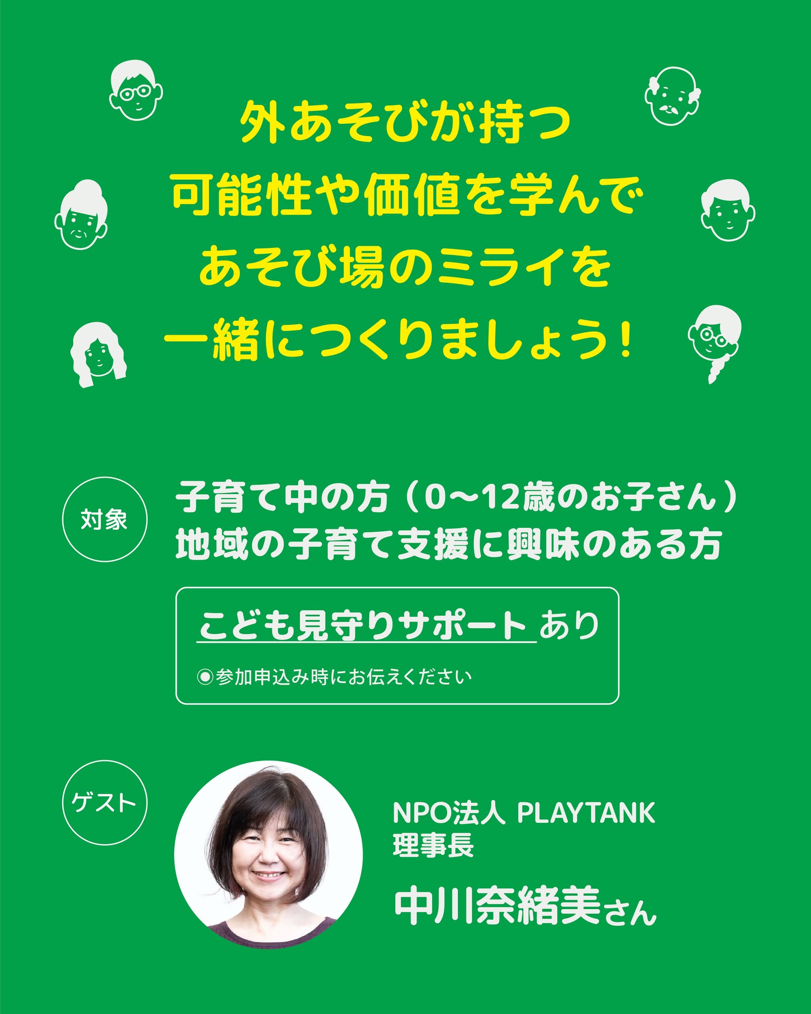 MAR 05 2025 イベント 学ぼう!プレーパークVol.2 ー子どもの未来を育む 外あそびのチカラー 【プレーパークうおづ特別セミナーVol.2】 合言葉は “みんなで外あそび” 「外あそび」は、こどもたちの成長にとって大切な時間。プレーパークの取り組みを学びながら、地域で楽しく子育てするヒントを見つけませんか? 今回のセミナーでは、東京都練馬区で「ちびっこプレーパーク」を運営する NPO法人PLAYTANK理事長・中川奈緒美氏 をお迎えし、外あそびの大切さや実践例をご紹介いただきます。また、参加者同士での交流を通じて、魚津でできる「子育て×公園」の新たな可能性を考えます。 当日は、魚津市ファミリーサポートセンターの協力会員による「お子様の見守りサポート」 もありますので、お子さま連れでも安心してご参加ください。 専用申込フォーム 日 程 3月23日(日) 13:30―15:30(受付 13:00-) 参加費 無 料 ※お子様の見守りサービスをご希望の方は申込フォームよりご連絡ください。 対 象 こどものあそび場や居場所づくりに興味がある方 子どもの教育や福祉に興味のある個人、団体など 講師紹介 NPO法人PLAYTANK 理事長 中川 奈緒美氏 1965年生まれ。立教大学卒。化粧品会社で商品ブランドマネージャ―職を経験した後、出産と夫の転勤を機に新潟県上越市で出産、子育て当事者として子育て支援団体の立ち上げに関わる。その後東京に戻り、保育園の立ち上げと運営、一時保育室と子育てひろば室の運営に携わりながら、NLP子育てコーチング、虐待防止プログラム、通信大学で児童学を学ぶ。2003年、市民活動の冒険遊び場/プレーパークをはじめ、2008年に練馬区補助事業の子育てひろば受託運営スタート、2011年にはNPO法人化し、理事長に就任、現在に至る。 申込方法 以下のフォームよりお申込み下さい。先着順。定員になり次第締め切ります。 ご興味のある方はお早めに! 専用申込フォーム 主催:NAPs(魚津総合公園賑わい創出パートナーシップ企業)共催:魚津市、ミラージュランド お問い合わせNAPs事務局(担当:飛世・中島)📞 080-7290-6247✉️ contact@uozupark.com Tweet Share +1 Hatena Pocket RSS feedly Pin it 投稿者: uozupark-adminイベント, コンシェルジュ通信, パークコンシェルジュ通信コメント: 0 つながるパークヨガ さくらまつり inみらパーク