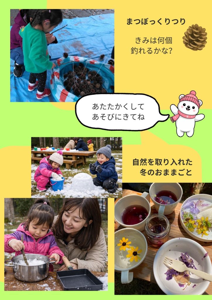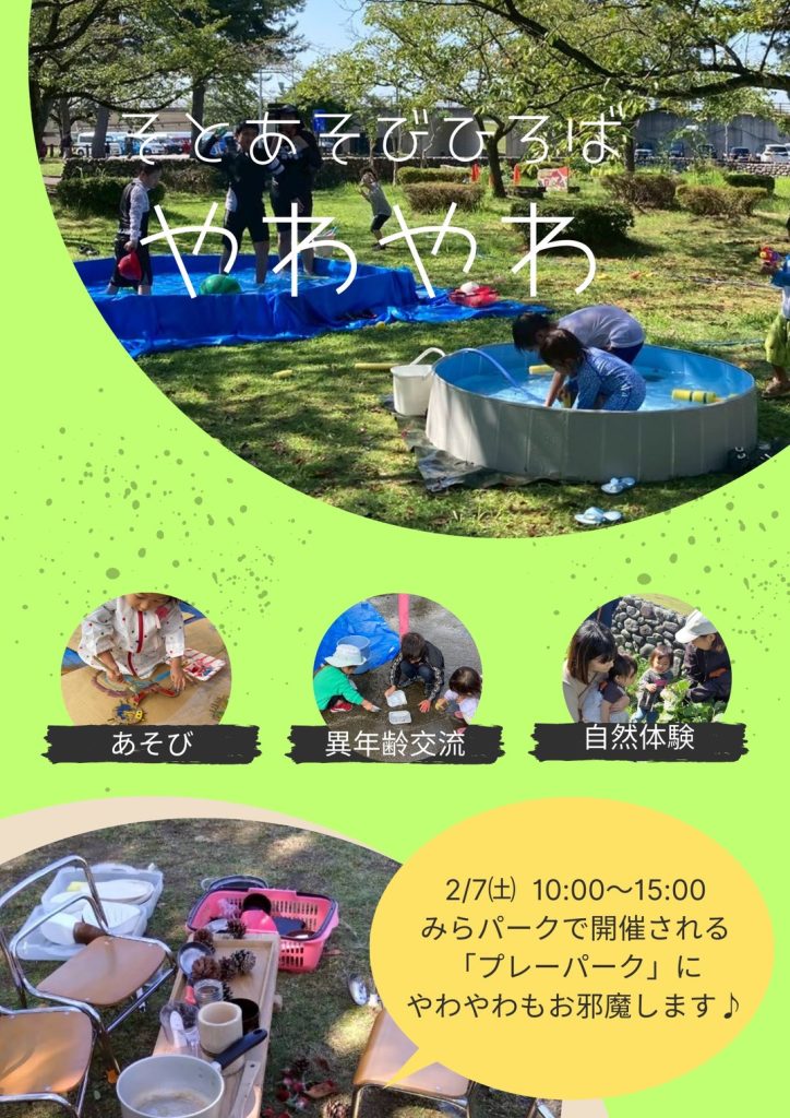FEB 08 2026 イベント プレーパークうおづ2025 今年も開催!1年通してプレーパークを楽しもう! 日本各地で今話題の新しい公園の使い方「プレーパーク」を体験しよう! 長野県からプレーリーダーさん2名が来園。 ~プレーパークとは~ 自分の責任で自由にあそぶ。 こども自身で考え、あそびをつくる場「プレーパーク」 プレーリーダーと呼ばれる”あそびの達人”と一緒にみらパークで思い切りあそびましょう! プレーパークうおづ追加情報 プレーパークうおづ2025表 プレーパークうおづ2025裏 目 次 みたいコンテンツ名をクリックし、詳細をチェックしよう! 【今年度の開催分】 〇 11/22(土) あったかい居場所を楽しもう!× インクルーシブプレーパーク 【終了しました】 〇 10/11(土) 秋を楽しもう!【終了しました】 〇 8/29(金)-30(土) 夏を楽しもう!× irodori marche Vol.4 【8/17詳細更新!】【終了しました】 〇 8/2(土) みらパーク×凸凹っこ作戦会議~インクルーシブプレーパークを考えよう~【終了しました】 〇 1/24(土) ミニプレーパーク【終了しました】 〇 2/7(土) 冬を楽しもう【終了しました】 〇 プレーパークのこれまでの活動紹介 プレーパークってどんな場所なのか見てみよう♪ コンテンツ紹介 冬を楽しもう! 【このイベントは終了しました】 ■2026年 2月 7日(土) 10:00-15:00 今期最後の開催です。 天候に合わせて開催。 雪が降ったら雪あそび、降ってない場合はかけっこや穴掘りなど。 2/7プレーパークうおづ 〇飲食ブース (1/22更新) ・Ume Kitchen・・ドッグパン、ソフトクリーム他 ・むすびや・・おにぎり他 ・KOMUGISAN・・スイーツ ・KEseRA・・ガパオライス他 ・ACHA YATRA・・スパイスカレー他インド料理 <出店募集は〆切ました> 【緊急開催決定!】 「自然体験・はじめの一歩」でもブース協力してくれた「そとあそびひろば やわやわ」が今季最後のプレーパークでも登場! \ 冬の自然であそぼう / おままごとブース 雪や木の枝、お鍋やフライパンを使って まぜまぜ・つめつめ・ひっくり返して… 親子でのんびり、冬ならではのごっこ遊び \ まつぼっくりつり / 意外と簡単?それとも難しい?? 自然物であそぼう! 寒い季節だからこそ、自然の中で思いきり遊ぶ体験を。 雨天時は無料休憩所みんなのみなとにて縮小開催です。 けん玉、皿回し、トンネル遊具、木工体験 などなど。 何ができるかはあなた次第! 乞うご期待。 ※あそべる内容は予告なく、変更になる場合があります。予めご了承ください。防寒対策をしっかりして、あたたかい服装でお越しください。 ※ 魚津水族館はメンテナンス休館日となります。予めご了承ください。 【追加開催決定!】ミニプレーパーク 【このイベントは終了しました】 ■2026年 1月24日(土) 13:00-15:00 大好評につき、おかわり開催決定! 「星槎国際高等学校富山センター」と「星槎フリースクール魚津」の皆さんにご協力いただき開催できることになりました! お正月明けということで 焚火でお餅焼きや雪あそびなど季節を楽しみましょう♪ 1/24プレーパークうおづ 〇飲食ブース (1/22更新) ・ACHA YATRA・・スパイスカレー他インド料理 ・Cafeアルモンデ・メデル・・ドリップコーヒー、ソフトドリンク他 ・Ume Kitchen・・ドックパン、チュロス他 <屋内出店> ・穂や菜・・米粉マフィンなど <募集は〆切ました> 雨天時の開催内容は当日をお楽しみに! あったかい居場所を楽しもう!× インクルーシブプレーパーク 【このイベントは終了しました】 ■ 2025年11月22日(土) 10:00-15:00 当日の模様はこちら!天候にも恵まれ、沢山のご来場、誠にありがとうございました! 大人も子どもも、障がいのある子もない子も、 み〜んなが一緒に楽しめる “あそび場” を開催します! 富山県内3市の子育て支援団体が座談会や作戦会議を重ねてつくった あたたかい想いがぎゅっと詰まった1日。 インクルーシブプレーパーク 〜あったかい居場所を楽しもう〜 日時:11月22日(土)10:00〜15:00 場所:みらパーク公園内(魚津水族館となり) 参加無料・出入り自由 〇 グラウンドルール ・自分のペースで自由にあそぼう ・あったかいまなざし・言葉でつながろう ・困ったときは話し合おう 〇 いっしょに外あそびしよう! サポートスタッフもいます。 〇 見守りを希望される方へ でこぼこっ子サポートスタッフによる見守りを希望される方は、事前に申込フォームよりご連絡ください。 ※託児ではありません。安全には配慮していますが、事故・けがの責任は負いかねます。 〇 サポーター募集中! 運営を支えてくれる仲間も大歓迎✨ 〇 持ち物 <晴天時>汚れてもいい服・着替え・タオル・飲み物 <雨天時>上記+雨具 当日はキッチンカーも多数出店予定! お会いできるのを楽しみにしています☺️ 近年、発達特性のある子を育てる保護者からは、「公園で周囲に気をつかい続けて疲れてしまう」 「“迷惑をかけないように”と人の少ない公園を探し回る」といった切実な声が聞かれます。 また、富山県内では通年のプレーパークを常設している公園がなく、子どもたちが